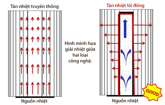 Ưu điểm: Nhiệt độ làm việc thấp hơn 58 độ C, hoạt động ổn định, tuổi thọ dài, khối lượng và trọng lượng nhỏ hơn so với tản nhiệt truyền thống.
