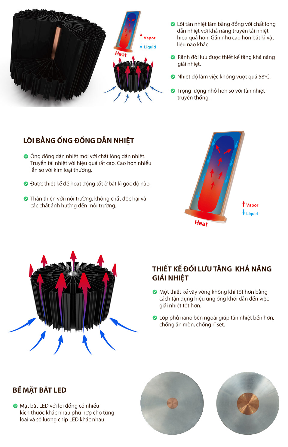 Bộ tản nhiệt được thiết kế lại hoàn toàn so với tản nhiệt truyền thống với lõi đồng giúp giải nhiệt độ khỏi con LED tốt hơn, dẫn đến tuổi thọ và hiệu suất cao hơn.